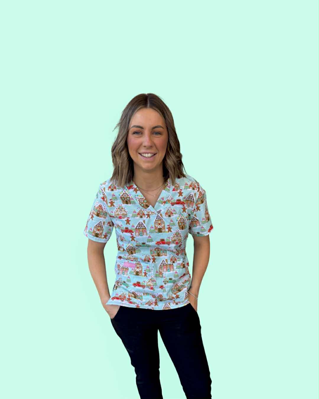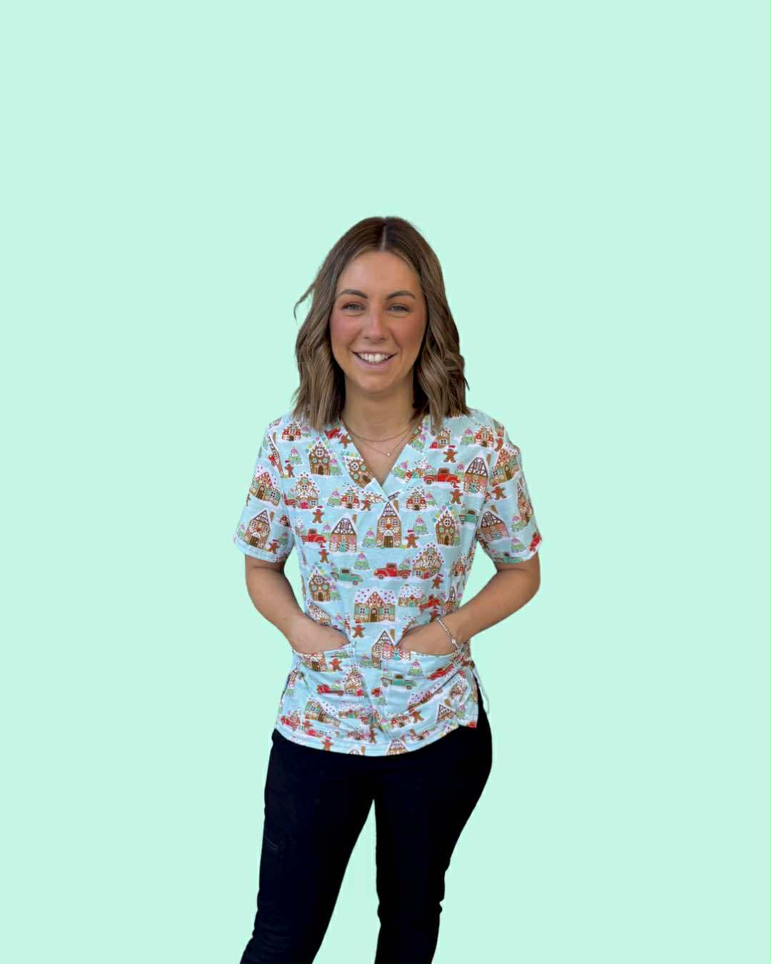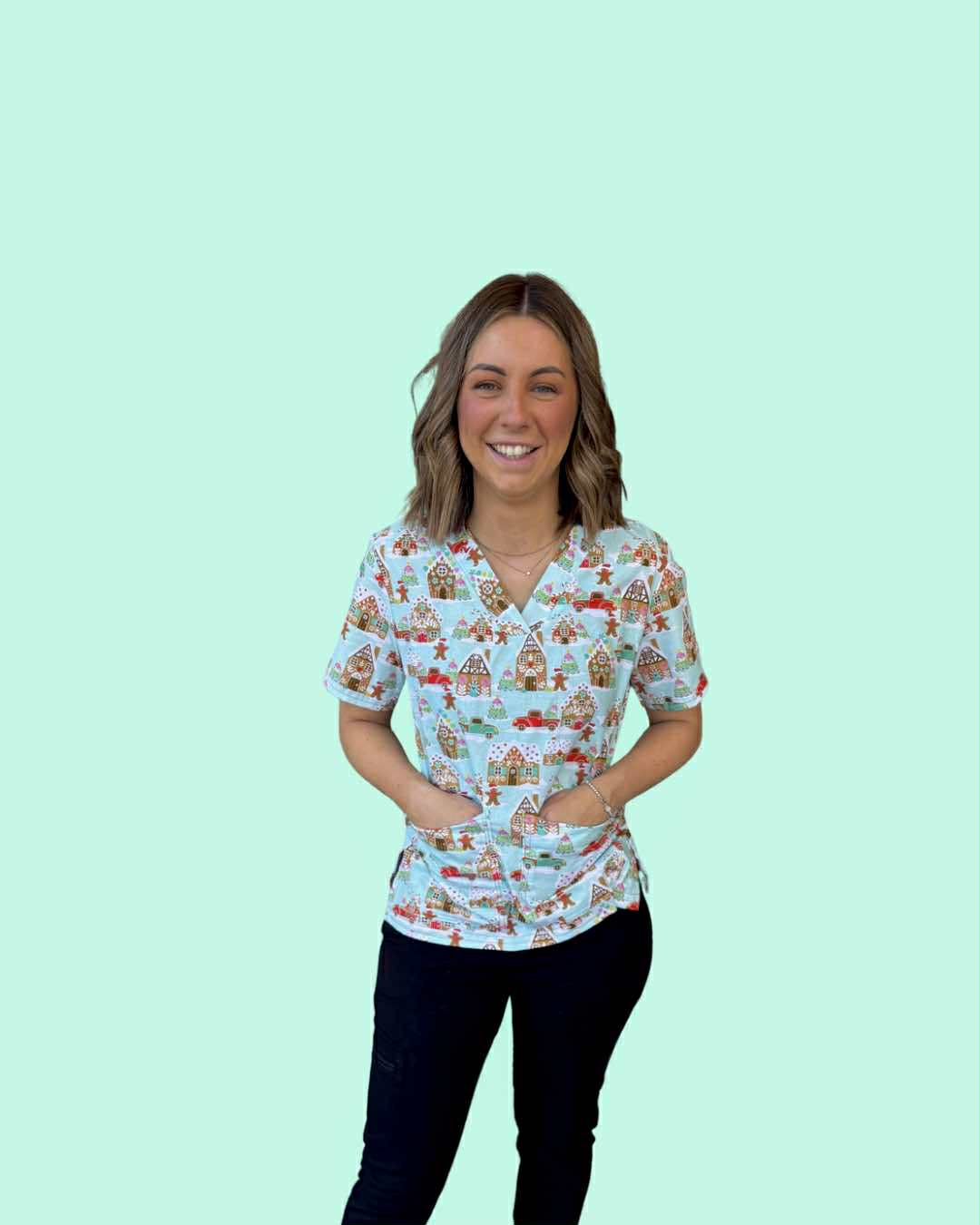 Get ready to sleigh your shift in theĀ Gingerbread Joy scrub top! Bursting with candy canes, cozy gingerbread houses, and festive vibes, this pastel green beauty is the perfect holiday pick-me-up. Whether youāre decking the halls or brightening a patientās day, this top brings the merry and bright.