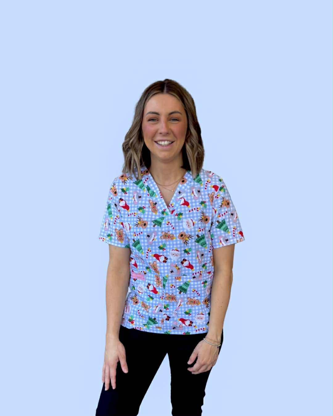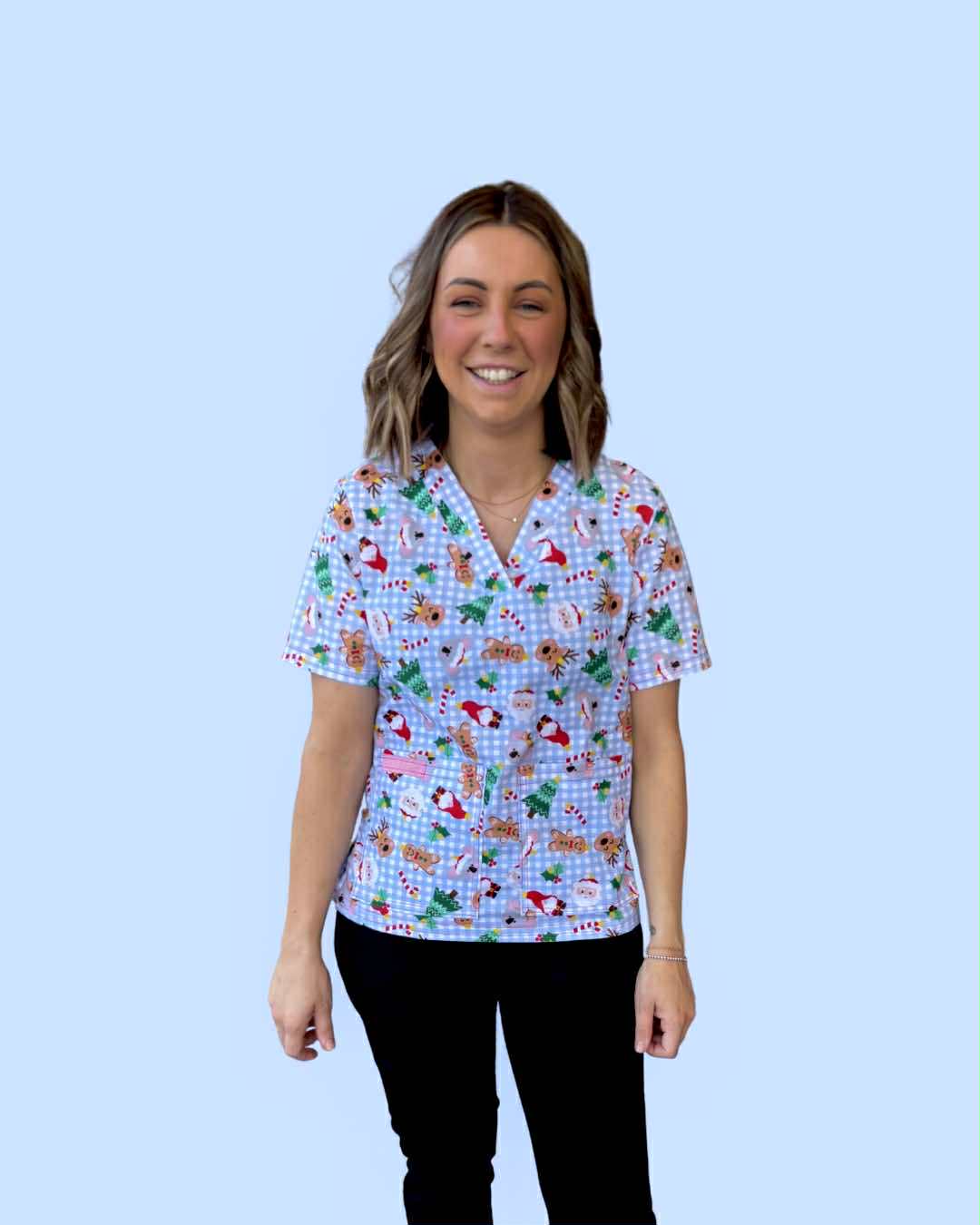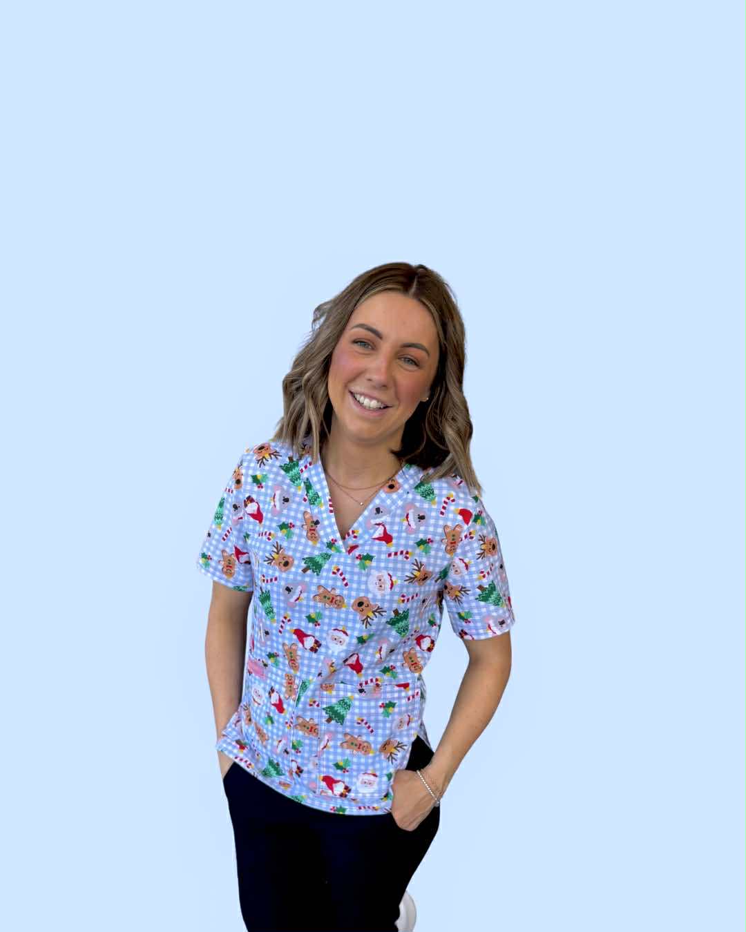 Bring a touch of holiday magic to your shift with the Winter Wishes scrub top! Featuring Santa, reindeer, gingerbread, and Christmas trees scattered across a pastel blue check, this print is as sweet and cheerful as the season itself. Light, fun, and oh-so-festive it’s Christmas joy, scrub-style.
