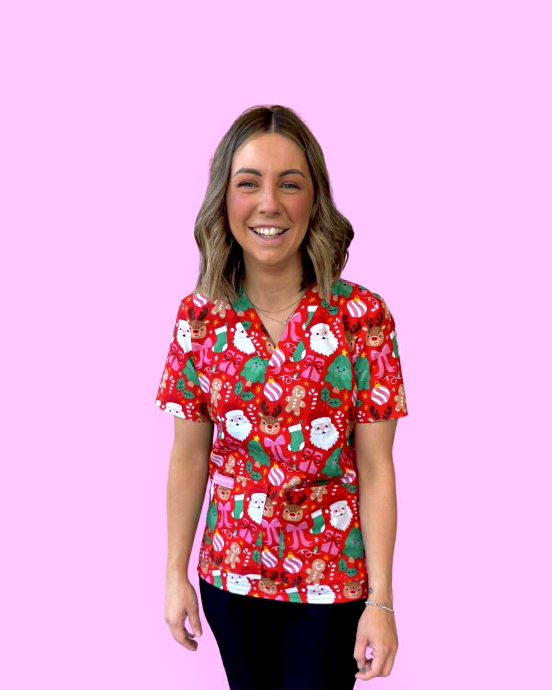 Make spirits bright with theĀ Festive Cheer scrub top! Covered in Santas, reindeer, gingerbread, and candy canes, this jolly print is the perfect way to bring holiday joy to your shift. Comfy, colourful, and full of Christmas magic, itās designed to keep you moving while spreading cheer all season long.