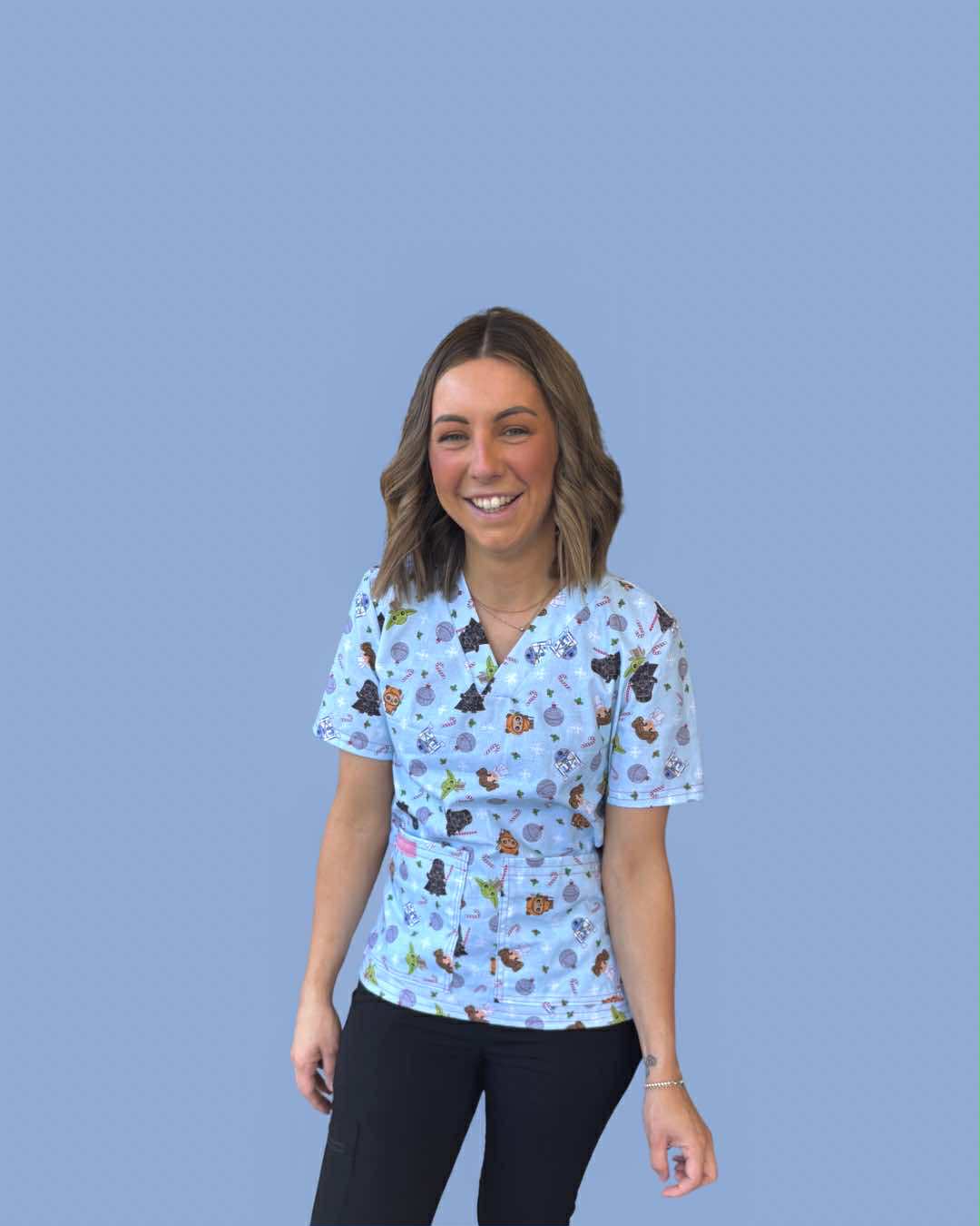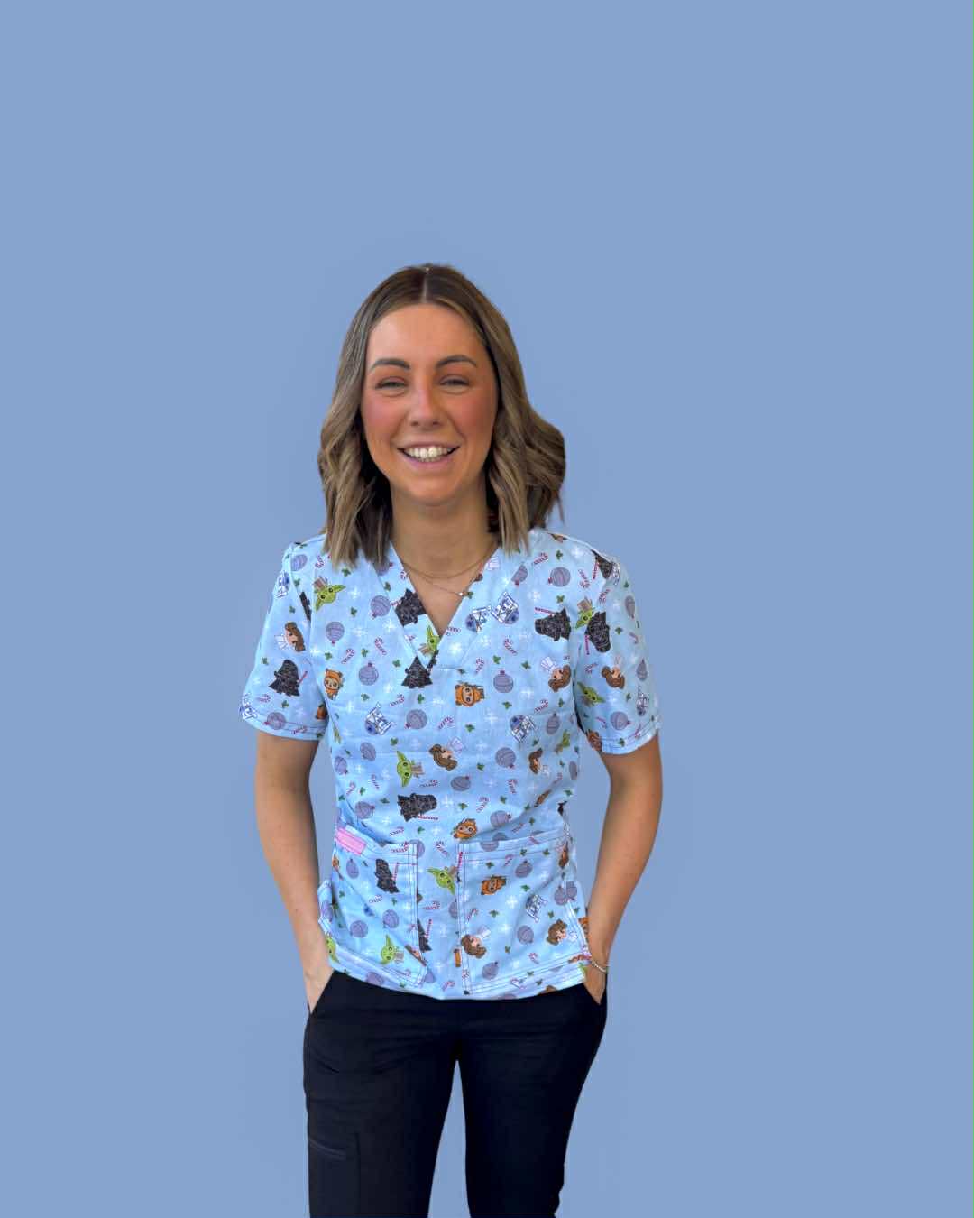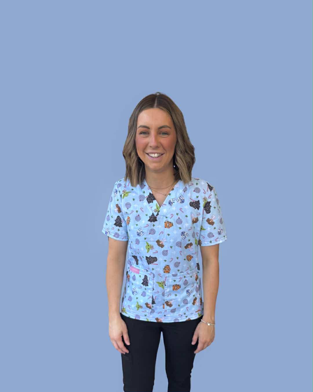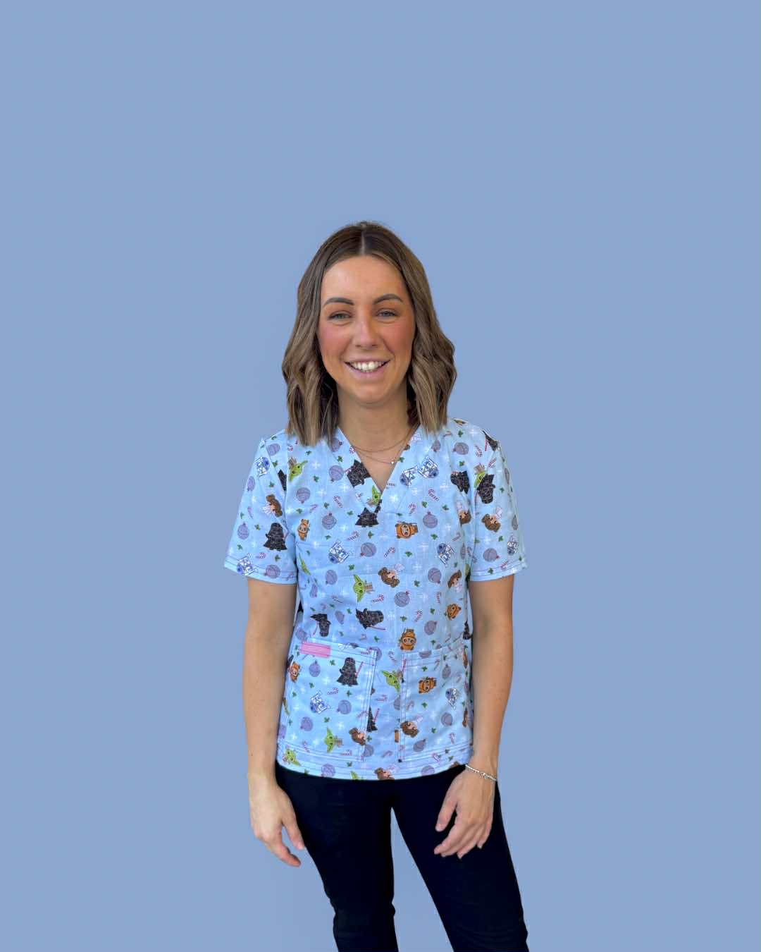 Celebrate the season in out-of-this-world style with the Cosmic Christmas scrub top! Featuring adorable holiday-dressed space creatures, festive planets, and intergalactic cheer on a frosty blue backdrop, this top brings a merry twist to the galaxy far, far away. Perfect for spreading joy to patients big and small during the holiday rush.