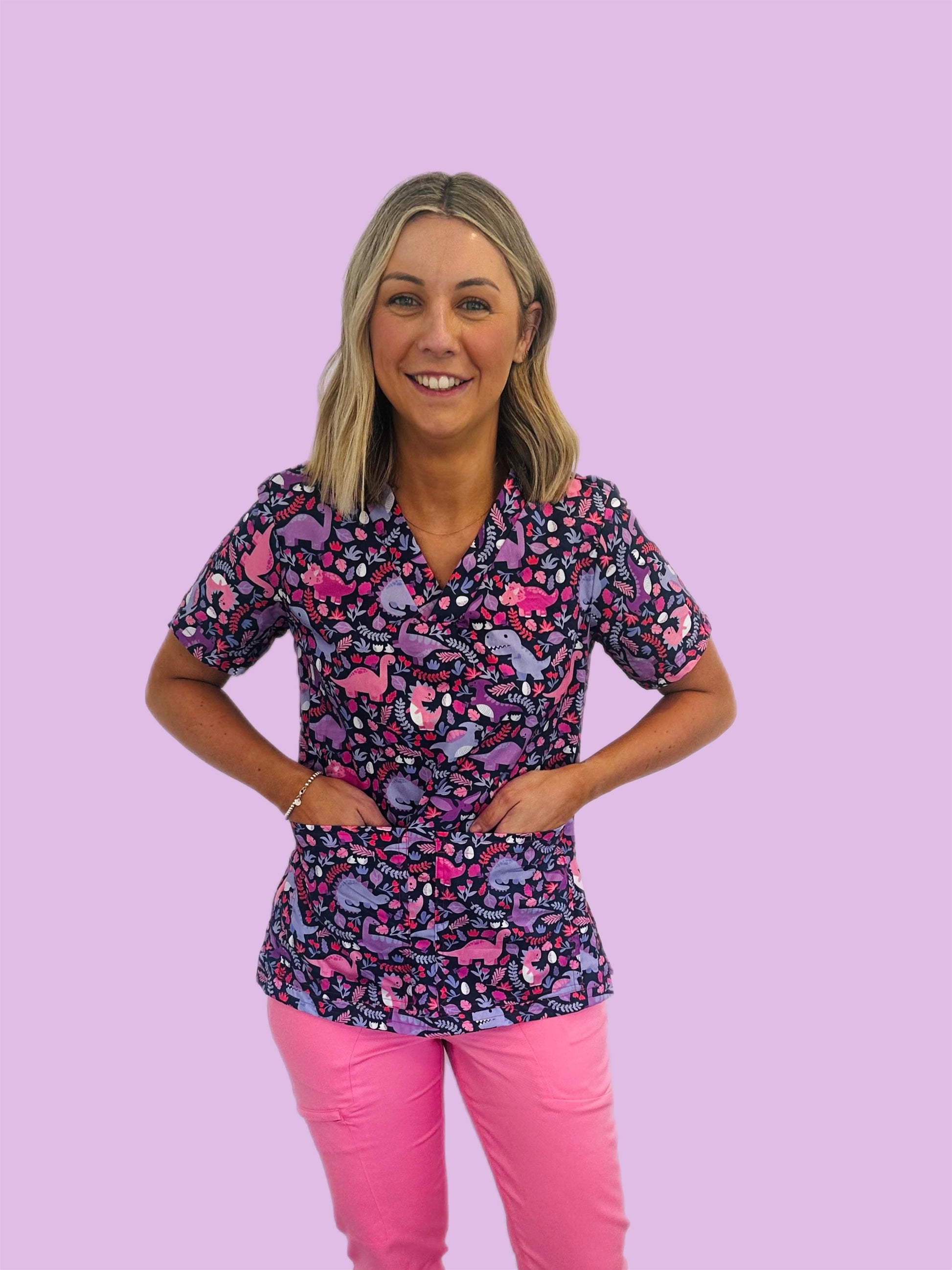 Roar loud. Move fast. Dino Vibes is the scrub top that makes every shift a prehistoric party.