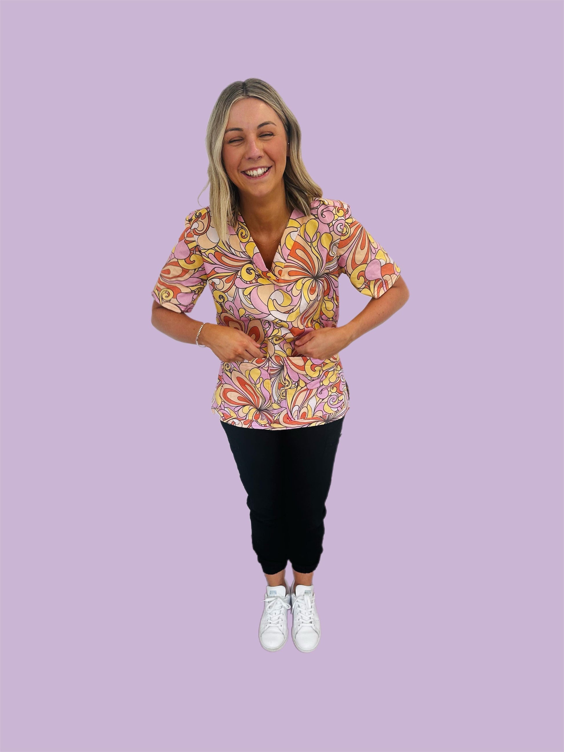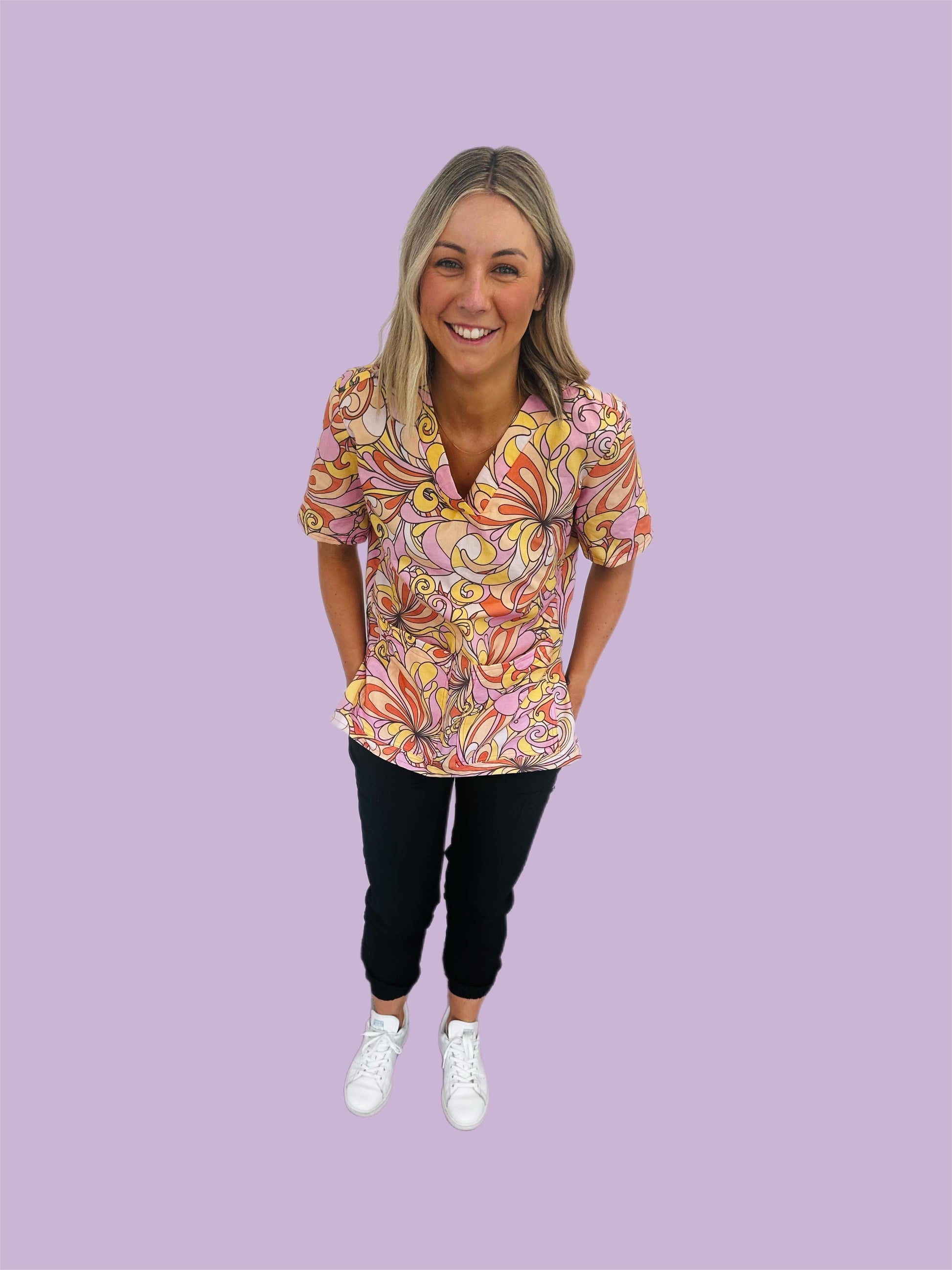Get ready to turn heads and channel retro cool in the Groovy Swirl scrub top. Bursting with bold, wavy patterns and disco-inspired energy, this top is all about expressing your fun side — even on the busiest days. With its vibrant colours, comfortable fit, and major ‘70s flair, it's made for the movers, the shakers, and the trendsetting scrub squad.