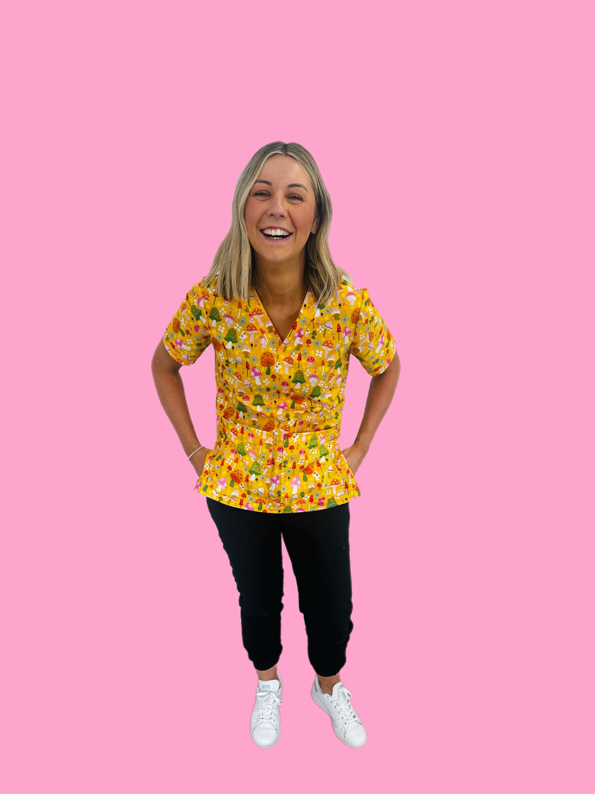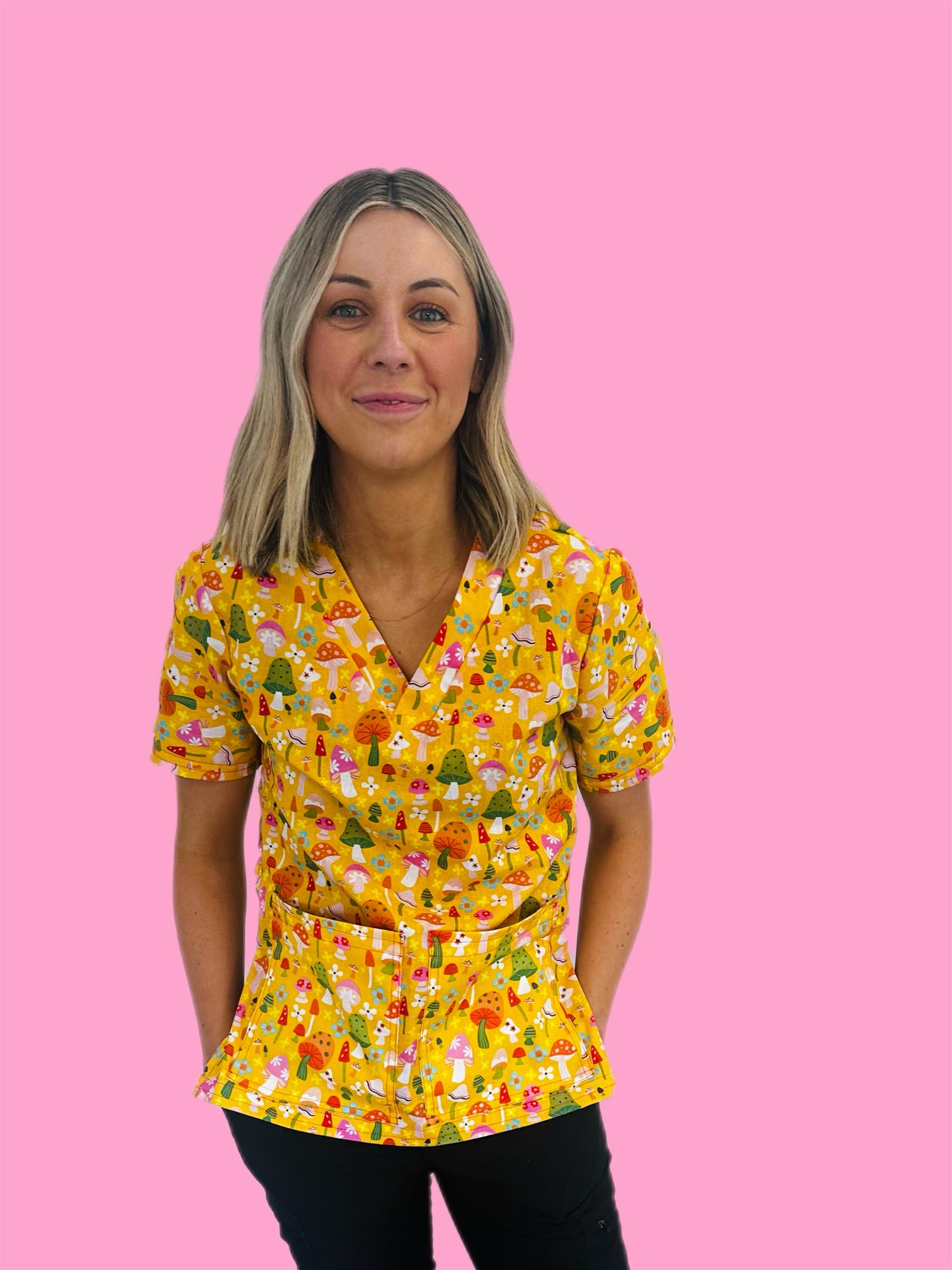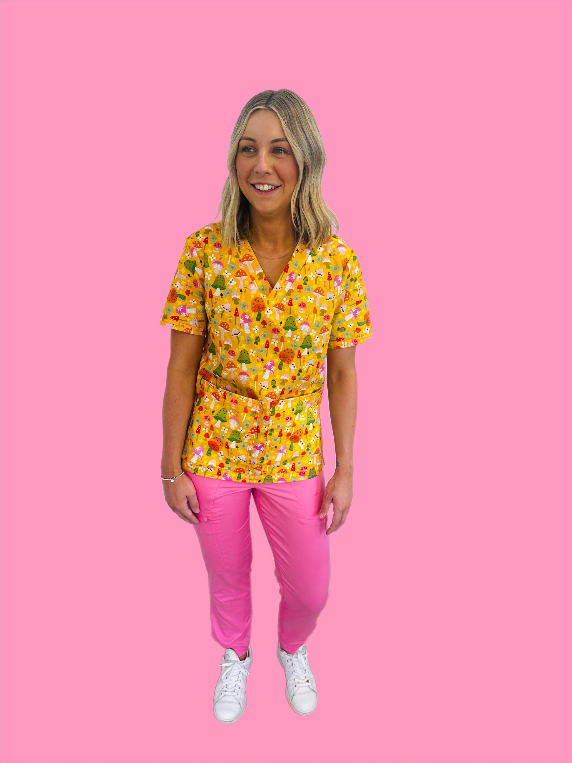 Step into a whimsical world with the Yellow Garden scrub top — where sunny yellow florals meet cute, charming mushrooms for a fresh, fun twist on classic garden vibes. This cheerful print brings a pop of nature’s magic to your shift, keeping you comfy and confident from start to finish.